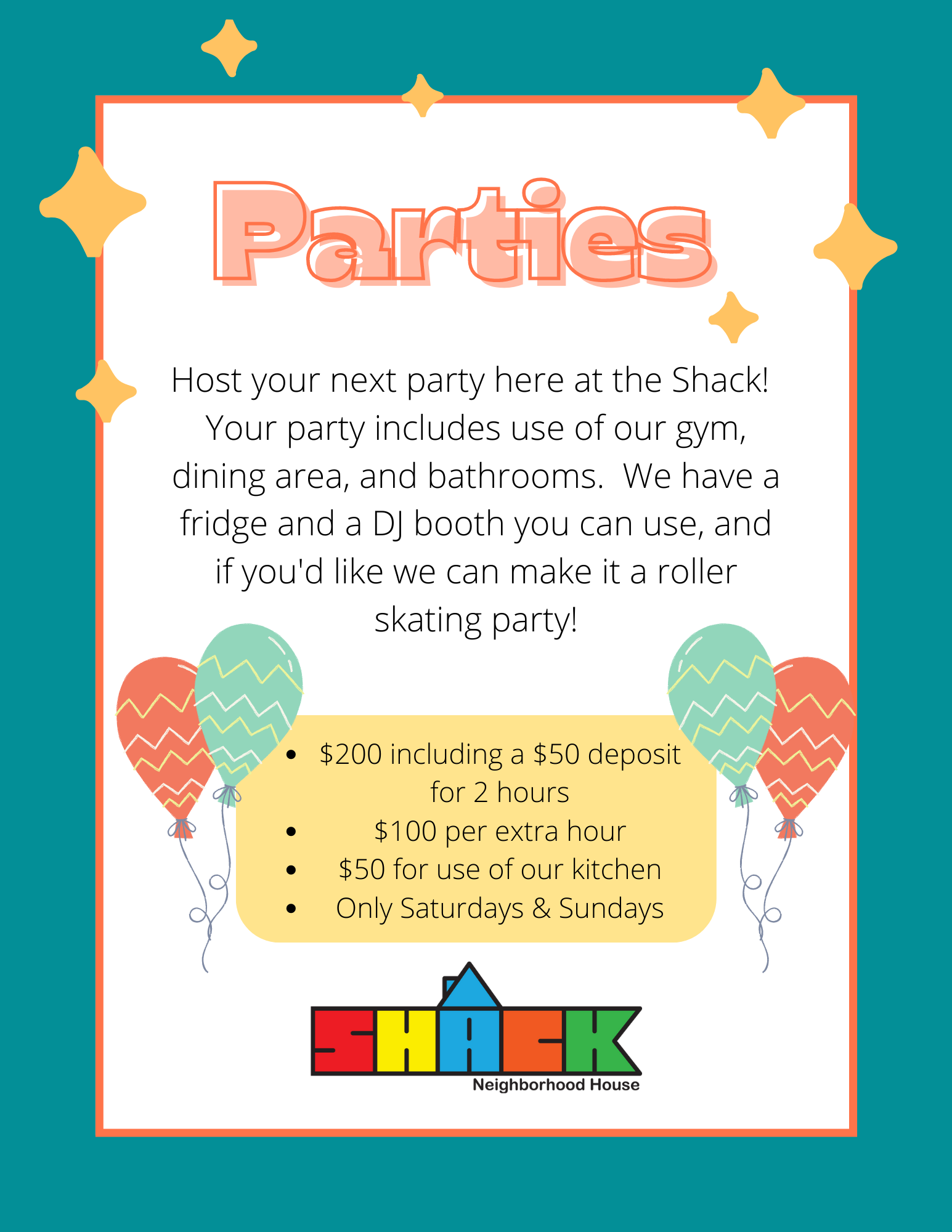 Book your next party with The Neighborhood Shack House! Party rentals are $200 ($50 non-refundable deposit and $150 rental fee).